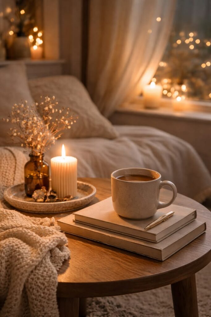 Designate one spot in your home as your recharge zone — a chair, a corner, a window seat. Fill it with a soft blanket, candles, and whatever makes you feel calm. A dedicated calm space changes how quickly you decompress after a long or stressful day.