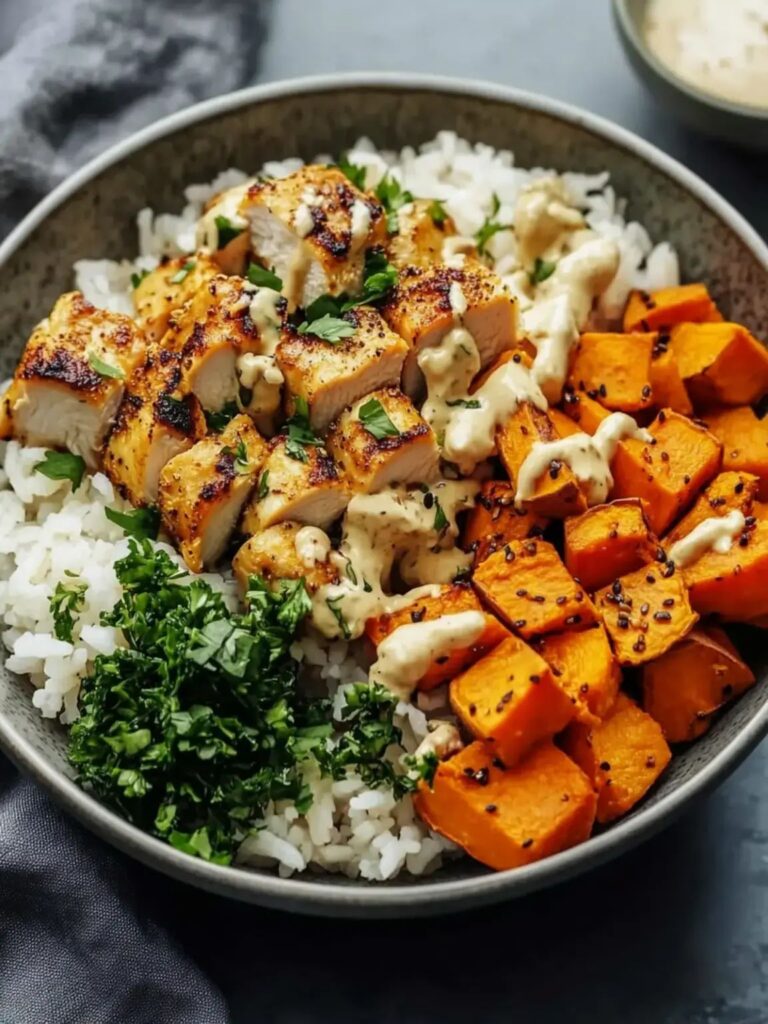 From the smoky seasoned chicken to the caramelized sweet potatoes and perfectly fluffy rice, every component works in harmony to create a bowl that’s as nourishing as it is satisfying. Whether you